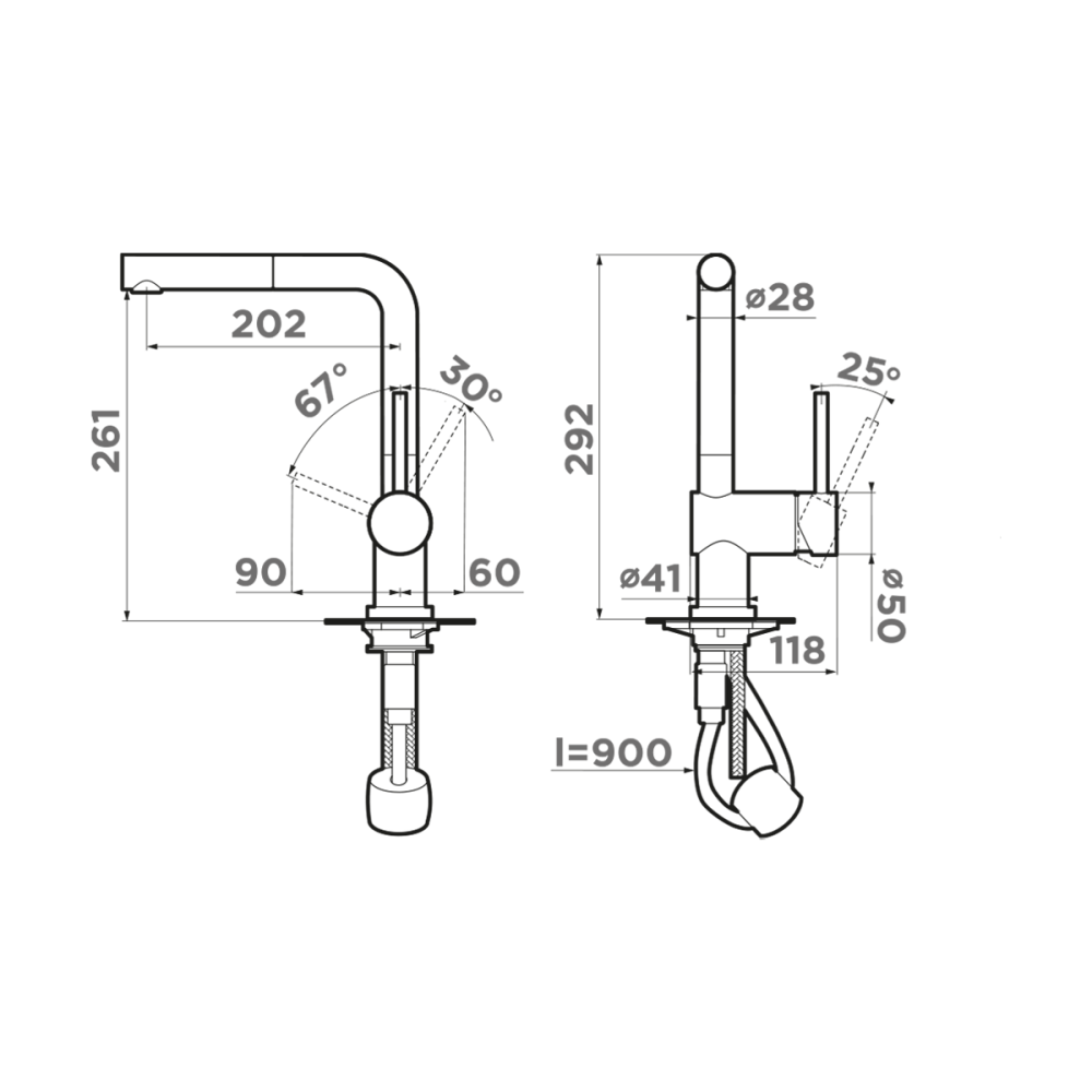 Смеситель для кухни Omoikiri Akashi оснащен рычажным управлением для регулировки температуры и напора воды. Горизонтальный монтаж на 1 отверстие. Вытяжной излив 202 мм.