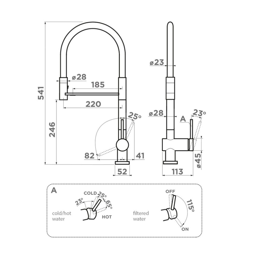 Смеситель для кухни Omoikiri Kanto-2 Plus с подключением фильтра оснащен рычажным управлением для регулировки температуры и напора воды. Горизонтальный монтаж на 1 отверстие. Гибкий излив 220 мм.