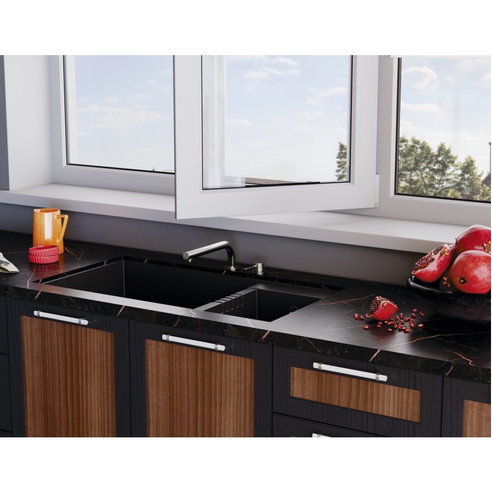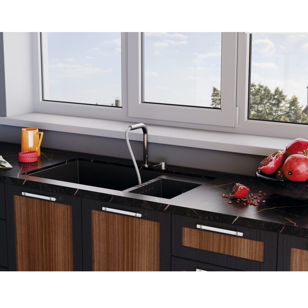 Смеситель для кухни Omoikiri Nara-S оснащен рычажным управлением для регулировки температуры и напора воды. Горизонтальный монтаж на 2 отверстия. Вытяжной излив 220 мм.
